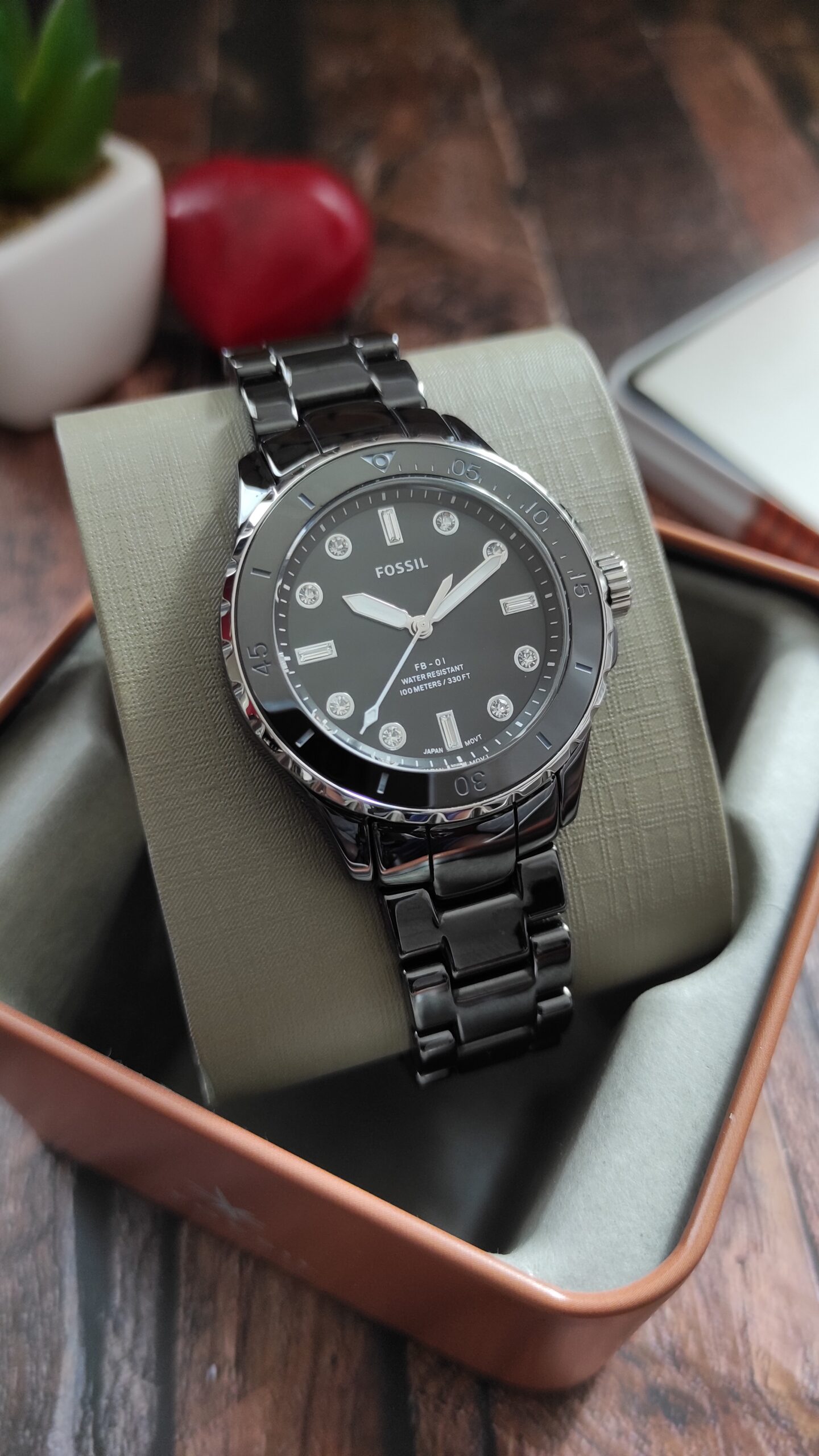 The Fossil CE1108 is a stylish, durable women’s watch from the FB-01 series, featuring a fully black aesthetic with a 36mm stainless steel case, black ceramic bracelet, and a 3-hand quartz movement. Designed for versatility and elegance, it offers 100M water resistance, a scratch resistant mineral crystal face, and a 2-pusher fold over clasp.