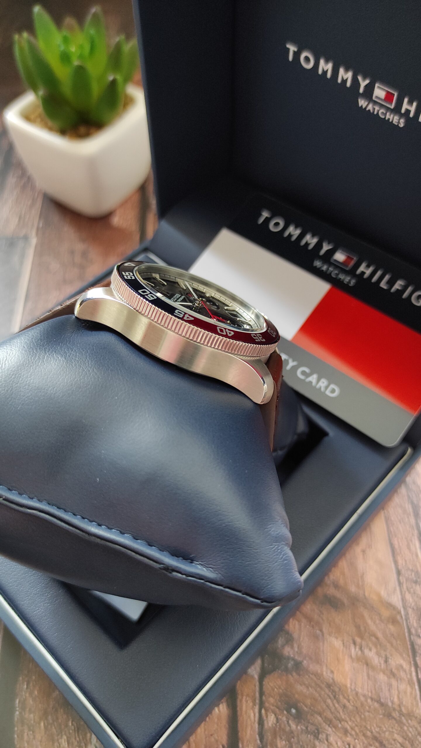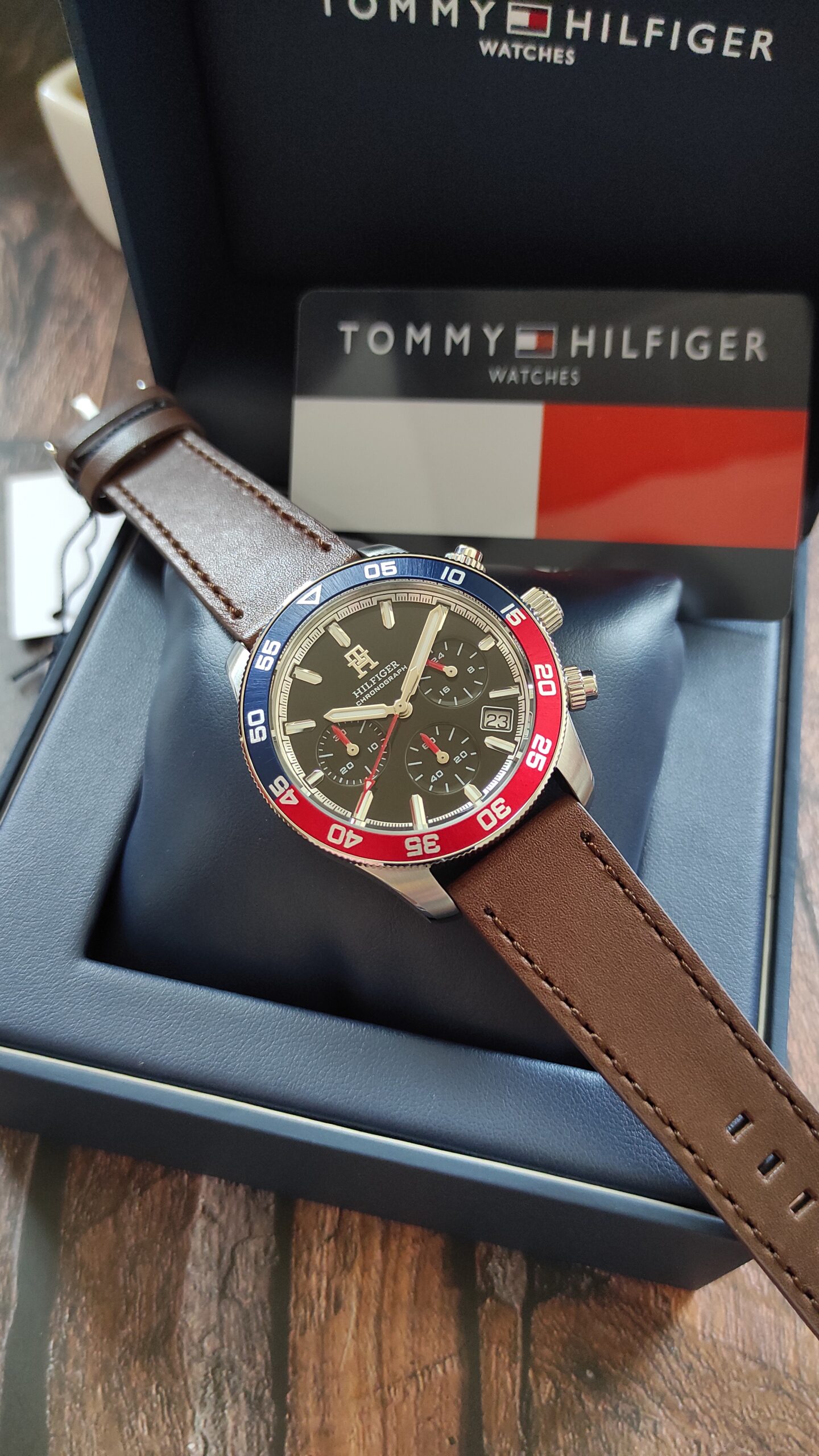 The Tommy Hilfiger TH85 1792166 is a 41mm men’s chronograph watch blending sporty, diver-inspired aesthetics with classic styling. It features a stainless steel case, a black dial with sub-dials (24-hour, stopwatch, date), and a unique red/blue (Pepsi) bezel. It is completed with a brown leather strap and 5 ATM water resistance.